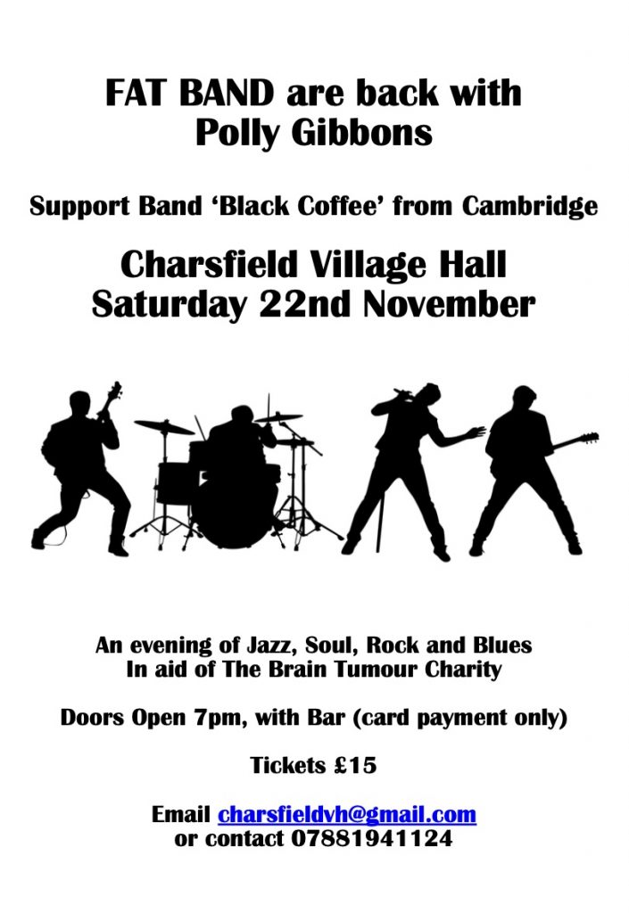 Fat Band are holding an evening of Jazz, Soul, Rock and Blues, in aid of The Brain Tumour Charity, in Charsfield Village Hall, on the 22nd November. Doors open at 7pm. Email charsfieldvh@gmail.com or contact 07881941124 to get your tickets.