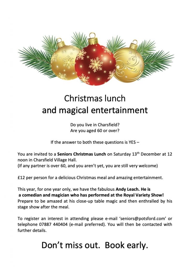 Christmas lunch and entertainment by a magician/ comedian on Saturday 13th December at 12 noon in Charsfield Village hall. £12 per person. Email seniors@potsford.com.